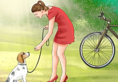 Keep a short leash. Any time you're out walking your dog, you may run into someone or something that elicits a dangerous or aggressive response. You can help reduce the risk of incidence by shortening your dog's leash when you approach other people or animals. A leash should be worn at all times when your dog is outside your home. If you see anything that you know may upset your dog, like a runner, bicyclist, skater, or another dog, pull your dog in close and hold the leash as short as possible.