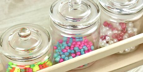 Use glass jars with lids to store any of your beads and supplies. Regardless of the size, shape, or type, glass jars with lids are a great option for storing your beads. You can use larger jars, such as mason jars, for larger beads and your jewelry-making supplies, and use smaller glass jars, such emptied baby food jars, for smaller beads and string.