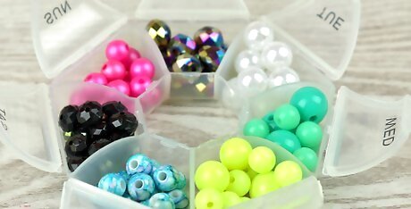 Keep small beads in pill organizer compartments for easier access. While most pill organizers will only hold 7 to 28 different types of small beads, they are a great way to keep your beads secure while you’re using them. Most pill organizers are made so that you can choose to open only one compartment at a time, making it easy for you to access the beads you need while keeping the others locked in place. Pill organizers can cost as little as $1 USD, making them a great cost-effective bead storage solution. You can also organize small beads in ice cube trays.