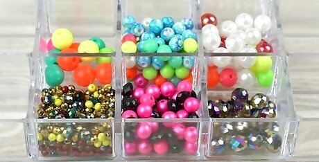 Get an organizing case specifically made for storing beads. If you want to store your beads in a case that’s specifically designed for bead storage, you can choose from a variety of different types that are widely available at craft and bead supplies stores. The most popular bead storage containers are generally plastic tray containers that have several compartments where you can separate your beads, as well as an attached lid to keep your beads from spilling out. Some bead storage tray containers are made to snap together, so you can keep all your beads securely together in one storage area. Bead organizing cases are generally made to be airtight so even the smallest of beads won’t spill out.