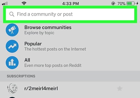 Search for the name of a subreddit or a topic. Tap the search bar at the top and type a topic of interest or the name of the subreddit you want to subscribe to.