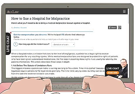 Find out how long you have to sue. All states have statutes of limitations that provide deadlines for how long you have to sue, but most states have shorter deadlines for medical malpractice lawsuits, regardless of whether you're suing the doctor or the hospital. Especially if you were dealing with a significant recovery, get friends or family to help you in the early stages. The statute of limitations may expire before you are physically or mentally able to handle the rigors of litigation. Search online for "statute of limitations" with the name of your state to find the right deadline. Make sure you're looking at the deadline for medical malpractice, which may be shorter than the deadline for a regular negligence or personal injury lawsuit. The clerk's office of your local courthouse or the law librarian at a public law library also may be able to help you.