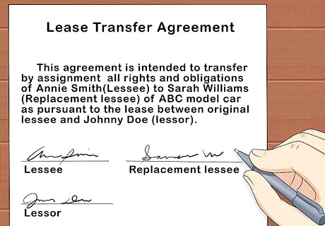 Sign a lease transfer agreement. If the car company approves the lease transfer and everything is in order, they'll have an agreement that transfers the lease from the original lessee over to you. Depending on your income and the results of your credit check, your lease terms may differ from those of the original lessee. Read the transfer agreement carefully and make sure you know what your payments will be, and what your responsibilities are at the end of the lease term.