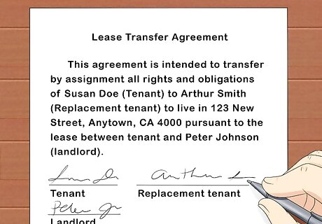 Sign the finalized agreement. Provide your draft to the landlord and the original renter. They may have comments or suggestions to amend the draft. Once everyone is satisfied with the agreement, print it out for everyone to sign. You, the original renter, and the landlord should all sign the sublease or assignment agreement. After the agreement is signed, make sure everyone has a copy.