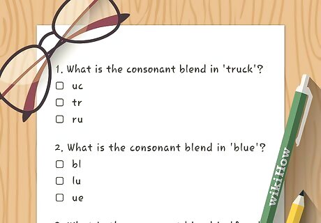 Create quizzes to test your students’ knowledge. Sites like “Kahoot” allow teachers to make their own quizzes tailored to lesson plans and their students’ learning levels. You can create a quiz and then allow your class to take it together, selecting the answer that the majority thinks is correct. This may also help you identify students that are having trouble grasping the concept of consonant blends.
