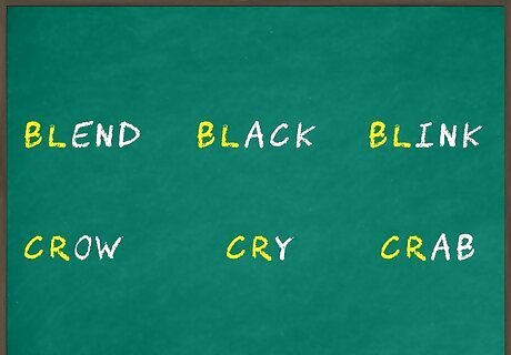 Start with 2 letter blends that begin words. Explain to students that 2 consonants together in 1 word make up a blend. These blends typically make a distinct sound. Choose several 2 letter blends to demonstrate what you’re talking about, and show multiple examples for each blend. On the board, write out several common blends and a word that goes along with them. For example, you could write “bl” and “blend,” “black,” “blink,” or “cr” and “crow,” “cry,” and “crab.” After you show several examples, ask students to help you come up with a word for each blend. Create a game out of it so your students are excited to think up new examples. If your students have a hard time thinking of new examples, provide hints about words you have in mind, such as visual cues.