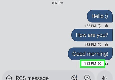 Look for the checkmarks in the text messages you send. If you use your Android phone or tablet to text someone who has an Android, you should see a checkmark if the message was sent successfully. If you don't see any checkmarks, make sure you have RCS chats enabled. If RCS is on, the person may have blocked your number. If only a message or two failed to send, it doesn't automatically mean you're blocked. Messages can get lost if the recipient has a spotty cellular connection. Other reasons include seeing the message and forgetting to reply. If multiple messages fail to send, it is likely the recipient blocked you. If you're using an iPhone and you text an Android user, you can check the delivery status underneath the message. If you see Delivered, the message has been sent successfully.