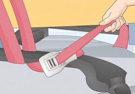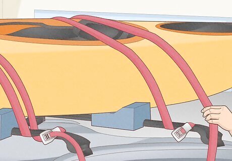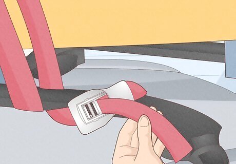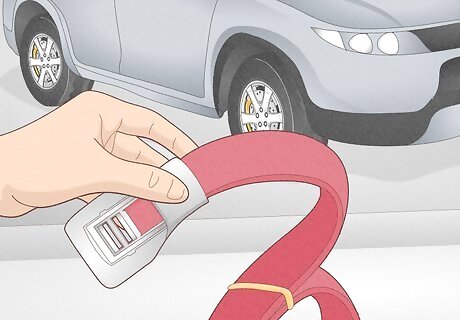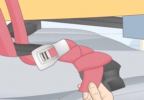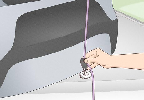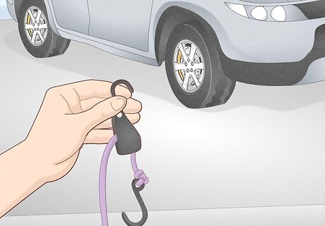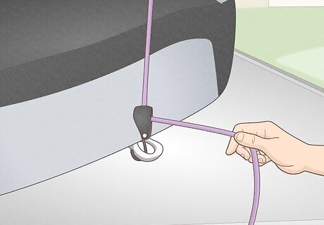 Hook the other end of the bow line to the tow hook under your bumper. The tow hook should look like a small metal ring underneath the bumper of your car. Don’t hook the bow line to the plastic part of your bumper or you could damage your car. If your car doesn’t have a tow hook, you may need to get a hood loop strap to use instead. Hood loop straps attach to the bolt heads under your hood. After you’ve bolted it on, close the hood so the fabric loop part of the strap is sticking out from the hood. Hook the bow line to that loop.
