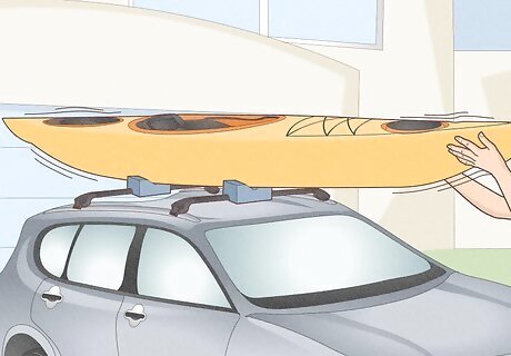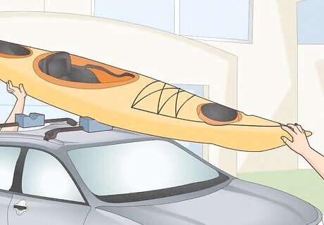 Lift your kayak onto the roof rack on your car so it's right side up. You may need someone to help you lift it. The bow (front) of your kayak should be at the front of your car, and the stern (back) of your kayak should be at the back.