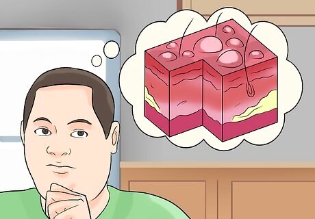 Understand how blisters develop. Blisters will not pop up immediately after sun exposure. Rather, they take a couple of days to develop. Burn blisters form when blood vessels are damaged and plasma and other fluids leak in between layers of skin, creating a pocket of fluid. Do not assume that the blisters are unrelated to your sunburn just because they appeared later. Harmful UV rays impact lighter skin tones more than darker ones, so you may be more or less susceptible to blistered sunburns than others, depending on your skin type. First-degree burns cause erythema, and blood vessels will widen, causing the skin to rise and become red in color. In the case of first-degree burns, only the outermost layer of skin is burned. However, damaged cells can release chemical mediators that can further irritate the skin and destroy other damaged cells. In the case of second-degree burns, inner layers of skin are also affected, as well as blood vessels. Thus, blisters are a sign of second-degree burns. This is why burn blisters are considered to be a much more serious condition than the average sunburn.
