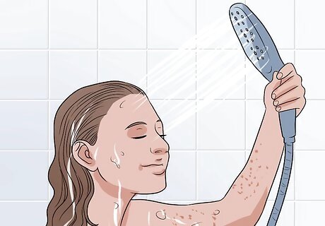 Shower in lukewarm water. Make sure the temperature of the water when you shower is just below lukewarm. Pay attention to the flow of the water, making sure it is very gentle so it does not aggravate your pain. In general, if you can avoid showering, do so. The pressure of the shower could prematurely pop your sunburn blisters, leading to pain, infection, and scarring. After showering, pat dry your skin using gentle movements. Don’t rub or wipe the skin with a towel as this can cause irritation.