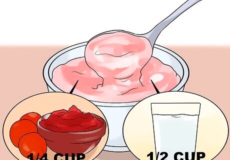 Consider using tomato. Tomato juice can lessen the burning sensation, reduce the redness of the affected area, and improve the healing of the sunburn. To apply, combine 1/4 cup of tomato paste or juice to 1/2 cup of buttermilk. Apply the mixture on your burned skin for about half an hour and wash it gently with cold water. Alternatively, add two cups of tomato juice to your bathwater and bathe your body in it for 10 to 15 minutes. For instant pain relief, apply mashed raw tomato mixed with crushed ice to the affected area. You could even try eating more tomatoes. One study has shown that people who ate five tablespoons of lycopene-rich tomato paste for three months had 25% more protection against sunburn.