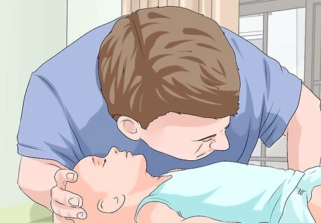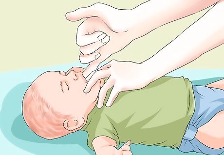 Look for an obvious obstruction. With the infant laying flat, tilt the baby’s head back and open his mouth. If you can see the object, remove it, but only if the object is easily removed. If the object is lodged, you don’t want to risk pushing it farther into the infant’s throat.