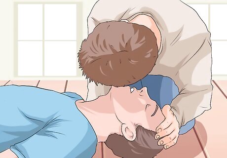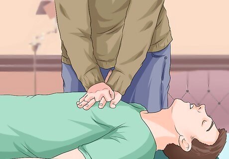 Perform chest compressions. If the person is unconscious, then you need to begin emergency CPR to maintain circulation and provide oxygen. Performing chest compressions on an adult is different than performing on an infant or a child. To perform chest compressions on an adult: Roll the person onto his back on a flat, hard surface (most likely the floor) and kneel down beside the person’s shoulders, so you don’t have to reposition between chest compressions and rescue breathing. Place the heel of your hand on the person’s chest between his nipples. Place your other hand directly over your bottom hand to provide more leverage. Position your upper body over your hands and use your body weight and your arms to compress the person’s chest. You want to compress two inches (five centimeters). Press quickly—a rate that allows you to perform 100 compressions per minute. However, ensure that the person’s chest rises completely between compressions. Count the compressions aloud to a total of thirty.