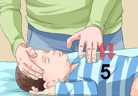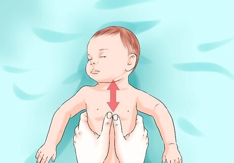 Perform chest compressions. If the infant is unconscious, then you need to begin CPR. The method for giving an infant CPR is different than with a child or adult. Begin with chest compressions that will help maintain blood circulation to the brain. To perform chest compressions on an infant: Place the infant on a hard, flat surface—a table or even the floor will suffice. Put two fingers on the center of the infant’s chest. Imagine a straight line between the baby’s nipples, and place the fingers just below where this line would be. Press down with your fingers to compress the chest around 1.5 inches (3.8cm). The rate of the compressions should be around 100 per minute. However, ensure that the infant’s chest rises all the way back up between compressions. Perform thirty compressions, counting them aloud as you go.