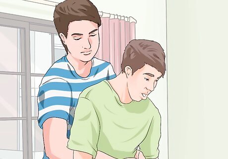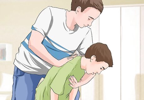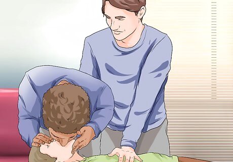Attempt to clear the airway if the person is conscious. If the person is unconscious or shows no signs of breathing, skip to the next step. This step should only be taken if the person is still conscious; otherwise you should begin CPR immediately. If the choking person shows signs of reduced breathing, then you want to attempt to clear the airway. Two methods are available based on how well you can move the person around: Back blows are the easiest option for a person who you cannot easily move. Roll the person onto his side or back and use the heel of your hand to thrust against the person’s back between the shoulder blades. Repeat fives times, watching for the object to dislodge. If you can lift the person, try abdominal thrusts (the Heimlich maneuver) by placing your fist just above the person’s navel and quickly thrusting in and upward with both hands. Also repeat five times while watching for the object to dislodge. Check for breathing. If the person stops breathing completely at any point or becomes unconscious, then proceed to CPR.
