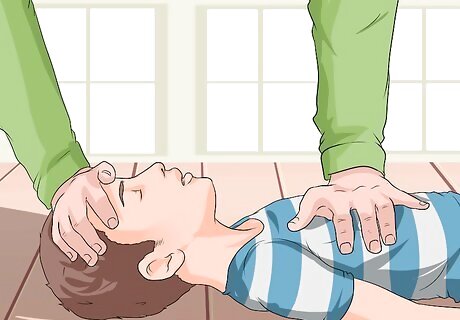 Perform chest compressions. If the child is unconscious then you need to begin emergency CPR to maintain circulation and provide oxygen. Performing chest compressions on a child is different than performing on an infant or an adult. To perform chest compressions on a child: Set the child down on his back on a flat, hard surface (most likely the floor), and kneel down beside the child’s shoulders, so you don’t have to reposition between chest compressions and rescue breathing. Place the heel of your hand on the child’s chest between his nipples. Use only one hand since two can provide too much force. Position your upper body over your hand and use your body weight and your arm to compress the child’s chest. You want to compress two inches (five centimeters). Press quickly at a rate of around 100 compressions per minute. However, you want the child’s chest to rise again completely between compressions. Count the compressions aloud to a total of thirty.
