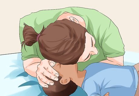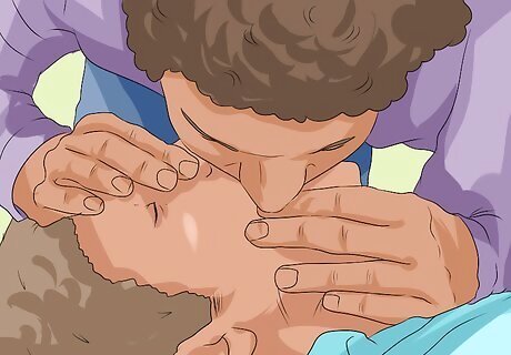 Perform rescue breathing if you are trained to do so. If the child is small enough, place your mouth over his mouth and nose. Otherwise, you can use mouth-to-mouth or mouth-to-nose breathing. Pinch the child’s nostrils closed for mouth-to-mouth breathing. To perform a rescue breath on a child: Cover the area with your mouth completely to form a seal. Deliver a breath that lasts approximately one second into the child’s airway. If air does not go in, re-position the head before you try one more breath. Provide a second breath before returning to chest compressions.
