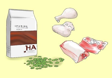 Switch your cat to a bland diet to help settle its stomach. A cat with chronic vomiting that is fed a rich diet, such as a premium supermarket food, may be sensitive to the humectants and additives, or indeed the rich nature of the food itself. Try changing your cat’s diet to a bland, white meat diet such as chicken breast, turkey, rabbit, cod, or coley. Feed your cat 100% meat for a few days, rather than a meat-flavored food. An average-sized cat needs roughly 250 kcal a day; this is equivalent to feeding your cat around 250 grams of chicken breast a day. Keep in mind that this should only be a temporary change. Your cat cannot get all of the necessary nutrients from 100% meat diet, which could result in broken bones and joint disease. An alternative to meat is to feed your cat one of the many prescription diets that are designed to speed up the healing of the bowel. Diets like Hills ID or Purina HA are ideal for a cat recovering from sickness.