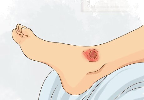 Check regularly for leg ulcers. These red, exposed breaks or holes in the skin typically appear on the lower part of the leg, usually showing up between the ages of 10 to 50. Such ulcers are more common in men. Ulcers may form due to trauma, infection of a wound, inflammation, or an interruption of circulation in the leg’s small blood vessels. Leg ulcers are visible openings in the skin, so regular visual inspection is the easiest way to detect them.