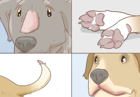 Check for pale, gray skin. Dogs that have frostbite will has discolored skin. This discoloration makes the skin appear pale, gray, or bluish instead of their skin normal color. This can be very hard to see, so you may need to look under their fur at different patches of skin.
