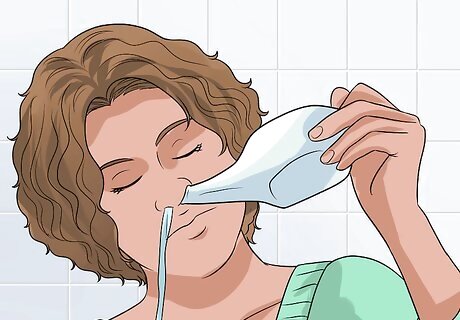 Irrigate your sinuses. Irrigating your sinuses with a saline rinse can help flush out environmental irritants (such as mold spores) and soothe your irritated, inflamed nostrils and sinus cavity. Nasal irrigation can be performed every day to help relieve the symptoms caused by your mold problem. You should only irrigate your sinuses with a squeeze bottle, bulb syringe, or neti pot designed to be used exclusively for nasal/sinus treatment. Only use distilled or sterile water. You can also boil and cool water, or use a filter with a pore size smaller than one micron to ensure that no microorganisms are present. Mix three large teaspoons of canning salt and one rounded teaspoon of baking soda. This will provide you with enough saline mix to make several batches of the nasal solution. Add between 1/4 and 1/2 teaspoon of saline mix to 1/2 cup (four ounces) of warm distilled or sterile water. Stir until it is completely dissolved, then administer it using your bottle, bulb syringe, or neti pot.