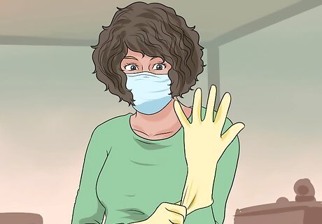 Wear protective gear when you clean. If you know you will be encountering a mold problem, wear a dust mask that completely covers your nose and mouth and disposable protective gloves. This will help prevent mold spores from entering your airways or irritating your skin. Use protective gear if you intend to clean an existing mold problem, fix a damp/wet environment in your home, or do yard work after a lot of precipitation. You can purchase protective gear at most home improvement stores or through an online retailer. Look for an N-95 respirator mask, which will protect your respiratory system from mold exposure. Kill the mold while wearing protective gear. Your protective gear should include an N-95 respirator, nitrile gloves, and a disposable gown.