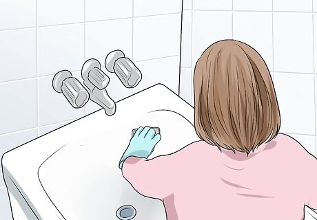 Prevent mold from growing. When it comes to mold, it's best to take preventative measures and reduce the chances of developing a problem in the first place. You can do this by reducing the moisture levels in your home and cleaning or removing objects that have grown mold. Clean your shower and/or bathtub on a regular basis. Mildew and mold can quickly build on the walls and curtains of your shower if left unattended. Fix any leaky pipes or water seepage immediately and clean up any standing water or condensation. Dampness, especially in cool, dark areas like a basement, can quickly lead to mold growth. Get rid of old paper products, particularly newspapers and books. Leaving these items in a damp environment like your basement can cause mold to develop very quickly. Use a fan to help ventilate your bathroom and prevent mold from growing.