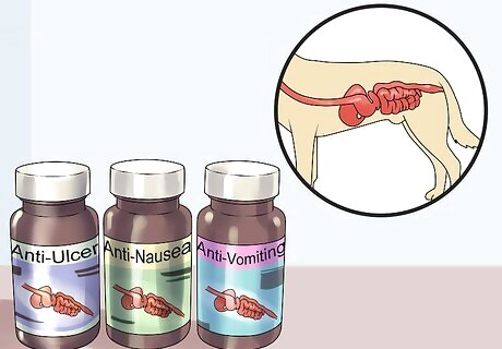 Treat your dog’s digestive upset. Liver disease can upset a dog’s digestive system. Sometimes, the disease can cause stomach ulcers. If your older dog has a stomach ulcer, your vet will prescribe an anti-ulcer medication. This medication will help your dog feel better and want to eat. Because steroids can also cause GI ulcers, your vet will recommend an anti-ulcer medication if your dog is on steroids. Liver disease can cause nausea or vomiting. If your dog has either of these symptoms, your vet will prescribe anti-nausea or anti-vomiting medications.