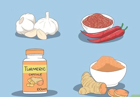 Add seasonings with anti-inflammatory properties to your food. Seasonings can be used to not only make your food taste great, but they can also actually reduce the inflammation in your hips caused by arthritis. Whenever you’re preparing a healthy meal, add seasonings that can help alleviate your symptoms. Fresh, uncooked garlic has is great for preventing inflammation. Chop up a clove or 2 and sprinkle it on your cooked food. Sprinkle ⁄4 teaspoon (1.2 mL) of cayenne pepper into your dish to add some heat and for the anti-inflammatory properties. Season your food with ⁄2 teaspoon (2.5 mL) of turmeric to help manage your joint pain. You can also take turmeric capsules 2–3 times each day so you’re more likely to see the anti-inflammatory effects.