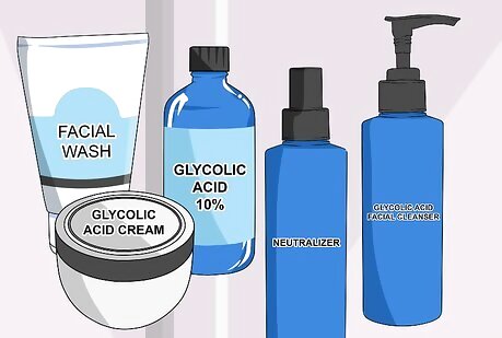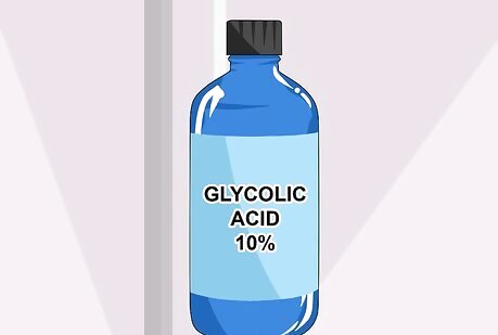 Find a product with a mild percentage of glycolic acid. Various types of skincare products will contain different levels of glycolic acid. Generally, products with less than 10% are considered safe and effective for daily, home use. If you have sensitive facial skin and are concerned about damaging or scarring your face, look for a facial cream that contains an amino acid, such as arginine. This protein will allow the acid to soak into your sensitive skin more slowly and so reduce potential stinging or skin discoloration. Almost any part of your skincare routine can contain a product with glycolic acid. This includes toners, cleansers, moisturizers, serums, and creams.