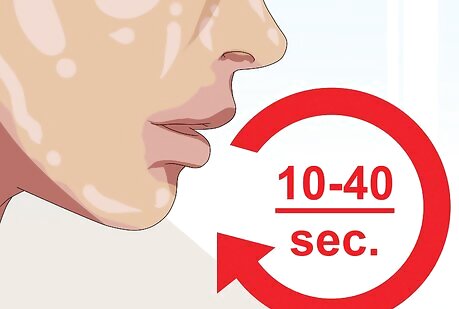 Apply the solution onto your face. Use a facial brush or cotton balls to gently apply the acid to your face. Start at your forehead and move in a counterclockwise direction to your left cheek, chin, and right cheek. Avoid putting it near your eyes, nostrils, and lips. Test the glycolic acid solution on a small part of your face before you put the peel over your entire face. Leave it there for five minutes. This will let you see how well you react to it.