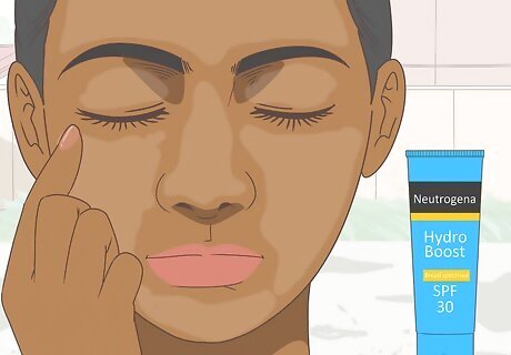 Remember to protect your eyelids from sunburn too! In addition to the eye protection methods listed above, apply sunscreen to your eyelids. Simply add a small dab of the sunscreen to your fingertip, close your eye, and gently massage the sunscreen into your eyelid before moving on to the other eye. Use an SPF-15 or greater, broad spectrum sunscreen that blocks both UVA and UVB light. Make sure to apply sunscreen to the rest of your face and other exposed skin as well. Mineral-based sunscreens (with zinc or titanium dioxide) may cause less of a stinging sensation than chemical-based ones if you do happen to get some in your eye. Should you get some sunscreen in your eye, flush it with clean water until the stinging sensation subsides. And don’t worry—the sunscreen won’t cause lasting damage. If you already have sunburned eyelids, treating them isn’t all that different from treating a sunburn on your face or anywhere else on your skin. Apply cool water, a cool compress, or pure aloe vera, drink plenty of water, and use OTC pain relievers as needed.