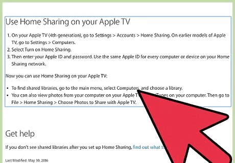 Verify that your Apple TV is connected to the same home network to which your computer is connected. Home Sharing will only work on your Apple TV if it’s connected to the same home network as your computer. To join your home network, use your remote to navigate to Settings > General > Network, then select the name of your Wi-Fi network.