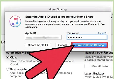 Select “Turn on Home Sharing,” then enter your Apple ID and password. If you don’t have an existing Apple ID, click on “Don’t have an Apple ID?” and follow the on-screen instructions to create an ID. You must have an Apple ID to use Home Sharing across multiple devices.