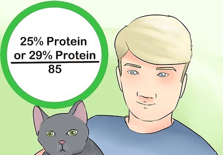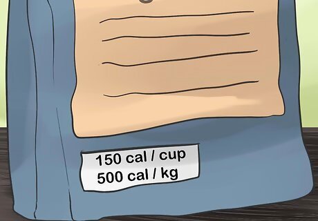 Check the caloric content. Look to the caloric content to determine the amount of calories your cat will receive from a single serving of food.The caloric content must be listed as kilocalories per kilogram, as well as in familiar household terms such as “per can” or “per cup.” The caloric content of products varies greatly. Make sure to examine the caloric content to determine how much to feed your cat.