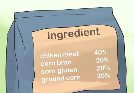 Take note of the order of ingredients. The ingredients on the list are ordered in terms of their weight. Following this logic, the top ingredients make up a higher percentage of the cat food than the ingredients at the bottom of the list. However, there is a caveat. To disguise undesirable ingredients, manufacturers will break them up into smaller components. This way they can place them at the bottom of the list, when in fact they make up a higher percentage of the product than the named meat. For example, a manufacturer may break up the ingredient corn meal into smaller components such as corn bran, corn gluten, and ground corn. If you combine the percentages of the smaller components together, then they may make up a higher percentage of the food than the meat and other ingredients listed at the top do.