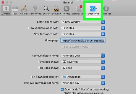 Click the Extensions tab. This option is near the top-right side of the Preferences window. If you see a message that says "Extensions can be enabled in the Develop menu" here, click the Advanced tab to the right and then click the "Show Develop menu in menu bar" box. This will force your extensions to display in the Extensions tab.