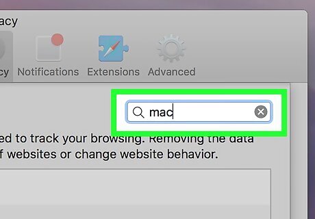 Click the search bar and type in mac. The search bar is in the upper-right side of the Privacy tab; typing "mac" in here will scan for any cookies that start with "mac", which will most likely comprise of MacKeeper cookies.