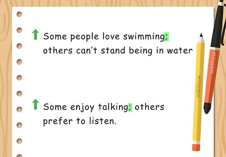 Create a compound sentence with a semicolon. You can also make a compound sentence with “some” and “others” using a semicolon instead of a colon. This is a good option if you want to compare two groups or perspectives in one sentence. For example, you may write, “Some people love swimming; others can’t stand being in water” or “Some enjoy talking; others prefer to listen.”