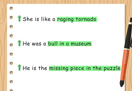 Create similes and metaphors with nouns. Similes and metaphors compare one thing to another. You can use descriptive nouns to create similes and metaphors. Adding them to a sentence can give it more detail and complexity. Similes use “like” or “as” to describe a subject. For example, you may write, “She was as skinny as a pole” or “She is like a raging tornado.” Metaphors compare one thing to another without “like” or “as.” For example, you may write, “He was a bull in a museum,” or “He is the missing piece in the puzzle.”