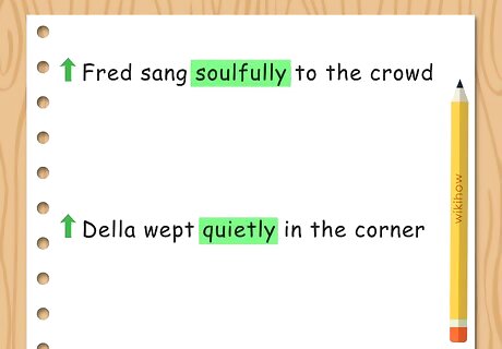 Make the sentence more descriptive with an adverb. Adverbs are a great option for adding more description and detail to a sentence. Adverbs end in -ly and describe the verb in the sentence. It should appear after the verb. For example, you may write, “Fred sang soulfully to the crowd,” or “Della wept quietly in the corner.”