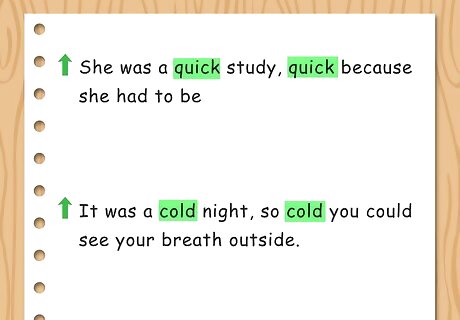 Repeat the same adjective twice. Another way you can use adjectives to uplevel your sentence is through repetition. Use a comma to separate the adjectives. Try to only use the same adjectives twice in a sentence. Repeating it three to four times can make the sentence feel redundant. For example, you may write, “She was a quick study, quick because she had to be” or “It was a cold night, so cold you could see your breath outside.”