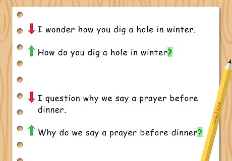 Make the sentence into a question. Sometimes you can uplevel a sentence by transforming it into a question. Having questions in a paragraph can help to vary the sentence type and add complexity to your writing. Use “who,” “what,” “where,” “how,” and “why” to start the question. For example, you may change a sentence like “I wonder how you dig a hole in winter” to “How do you dig a hole in winter?” or “I question why we say a prayer before dinner” to “Why do we say a prayer before dinner?”