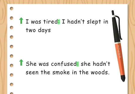 Make a compound sentence with a colon. Compound sentences is when two independent clauses are brought together. Use a colon to separate the two clauses so they are still distinct and easy to read. Only combine two clauses that relate to each other directly. For example, you may write, “I was tired: I hadn’t slept in two days” or “She was confused: she hadn’t seen the smoke in the woods.”
