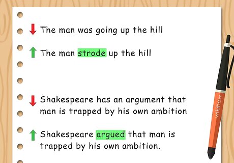Use strong verbs in the sentence. Strong verbs are usually connected to a direct action the subject is doing in the sentence. They carry a specific meaning. Avoid weak verbs, such as "to be" or "have." Strong verbs will grab the reader’s attention and add more intent to the sentence. For example, rather than write, “The man was going up the hill,” you may write, “The man strode up the hill” or “The man ran up the hill.” You may also use strong verbs in an academic paper to describe a source. For example, rather than write, “Shakespeare has an argument that man is trapped by his own ambition,” you may write, “Shakespeare argued that man is trapped by his own ambition.”