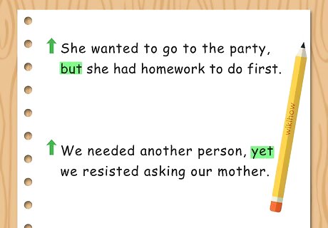 Use “however,” “so,” and “and.” Connecting terms can be a good way to extend the length of a sentence and make it more complex. “however,” “so,” “and”, and “yet” are all good connectors you can put in a sentence to give it more detail. Always put a comma before the connector. For example, you may write, “She wanted to go to the party, however she had homework to do first.” Or you may write, “He finished dinner early, so he went for a walk around the neighborhood.” Another example would be, “They ran through the square shouting, and it angered the locals,” or “We needed another person, yet we resisted asking our mother.”