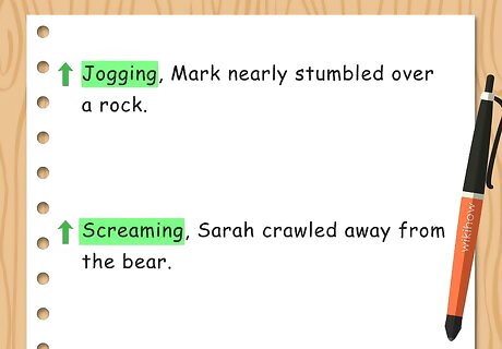 Start the sentence with a verb. This will put the reader right in the heart of the action from the very start. Use a verb with -ing at the end, followed by a comma. The verb should describe the action of the subject in the sentence. For example, you may write, “Jogging, Mark nearly stumbled over a rock.” Or you may write, “Screaming, Sarah crawled away from the bear.”