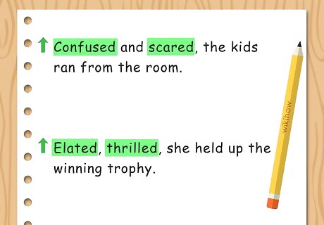 Describe an emotion with an adjective. You can also use adjectives in the sentence to tell the reader how a subject is feeling emotionally. Place the adjective at the beginning of the sentence and end it with -ed. You can have more than one adjective at the beginning of the sentence, but try not to have more than one to two at a time. For example, you may write, “Confused and scared, the kids ran from the room.” You do not have to use “and” to separate the two adjectives. For example, you may write, “Elated, thrilled, she held up the winning trophy.”