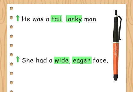 Improve the sentence with more than one adjective. Adjectives should describe the subject of the sentence in detail. They should paint a detailed picture of the subject for the reader. Having more than one adjective will add more detail and give the reader a better sense of the subject. Use a comma to separate the two adjectives. For example, you may write, “He was a tall, lanky man” or “She had a wide, eager face.” Having more than two adjectives in one sentence to describe the subject can make the sentence wordy and confusing. Try to have no more than two adjectives in a sentence.